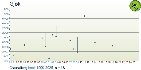 Her ser du resultater av merkeaktiviteten på Jomfruland Fuglestasjon. Du kan velge om du vil ha Dagstall (detaljerte merketall for hver dag), Månedslister (totalsum hver dag for en måned), Sesongdata (status for sesongen), Årslister (artsoversikt for et år) eller Artsliste Jomfruland fuglestasjon (Hele artslisten for merkede fugler på Jomfruland Fuglestasjon).