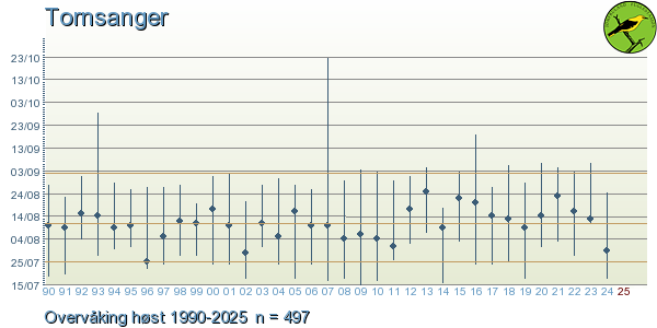 Her ser du resultater av merkeaktiviteten på Jomfruland Fuglestasjon. Du kan velge om du vil ha Dagstall (detaljerte merketall for hver dag), Månedslister (totalsum hver dag for en måned), Sesongdata (status for sesongen), Årslister (artsoversikt for et år) eller Artsliste Jomfruland fuglestasjon (Hele artslisten for merkede fugler på Jomfruland Fuglestasjon).