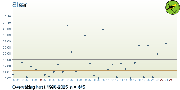 Her ser du resultater av merkeaktiviteten på Jomfruland Fuglestasjon. Du kan velge om du vil ha Dagstall (detaljerte merketall for hver dag), Månedslister (totalsum hver dag for en måned), Sesongdata (status for sesongen), Årslister (artsoversikt for et år) eller Artsliste Jomfruland fuglestasjon (Hele artslisten for merkede fugler på Jomfruland Fuglestasjon).